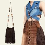 Este bolso de mano de ante sintético negro con flecos es el epítome de la elegancia con un toque de carácter bohemio. Con una anchura de 23 cm y una altura de 38 cm, es a la vez compacto y espacioso, perfecto para llevar lo esencial de cada día. El tejido de imitación de ante le confiere una refinada suavidad, mientras que los flecos añaden movimiento y un toque de tendencia. Este bolso es perfecto tanto para looks urbanos chic como informales y es ideal para salidas diurnas o nocturnas, añadiendo un toque de sofisticación a tu estilo.