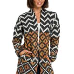 Un original cárdigan desabrochado con un colorido estampado azteca te abrigará en los días fríos y te seducirá con su diseño único. El cárdigan tiene bolsillos en las costuras laterales.