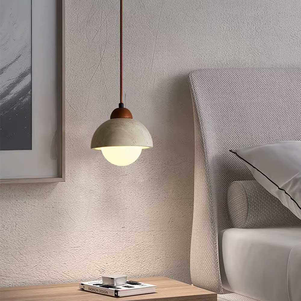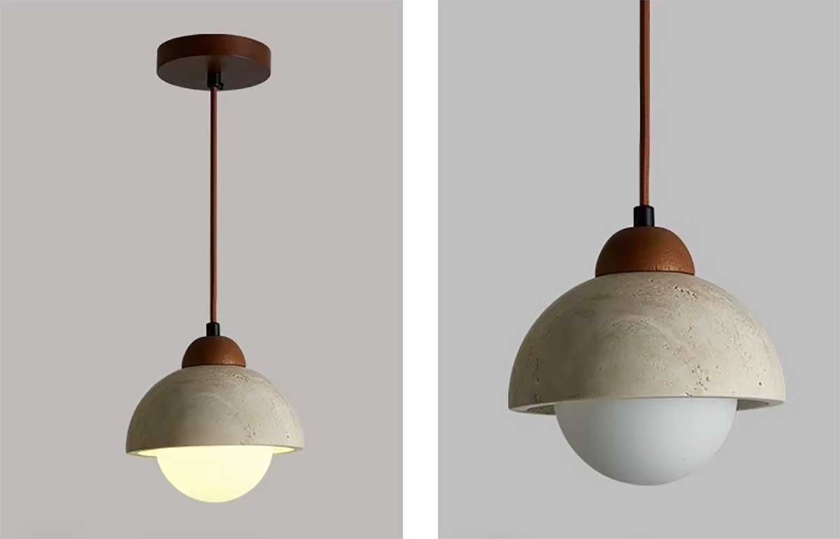Su formato compacto la hace perfecta como lámpara colgante de cabecera, encima de una mesilla de noche, un rincón de lectura o un pequeño comedor. Gracias a las variaciones naturales del travertino, cada pieza es única y acentúa el carácter artesanal y bohemio de la lámpara.