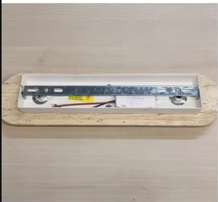 Apueste por la elegancia natural con este plafón de travertino y madera en formato alargado de 50 x 10 x 2 cm. Su diseño minimalista realza la piedra y la madera, creando una luminaria a la vez moderna y cálida.